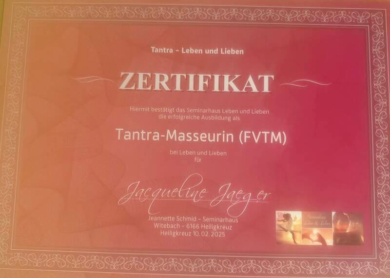 Durch den Besuch der 4 Zyklen bei Leben & Lieben im Seminarzentrum Witebach in Heiligkreuz, wurde ich inspiriert die Tantramassage zu erfahren und die Ausbildung zu machen. Ich habe meine Ausbildung erfolgreich mit einem in der Schweiz anerkannten Zertifikat "Tantramasseurin" abgeschlossen.